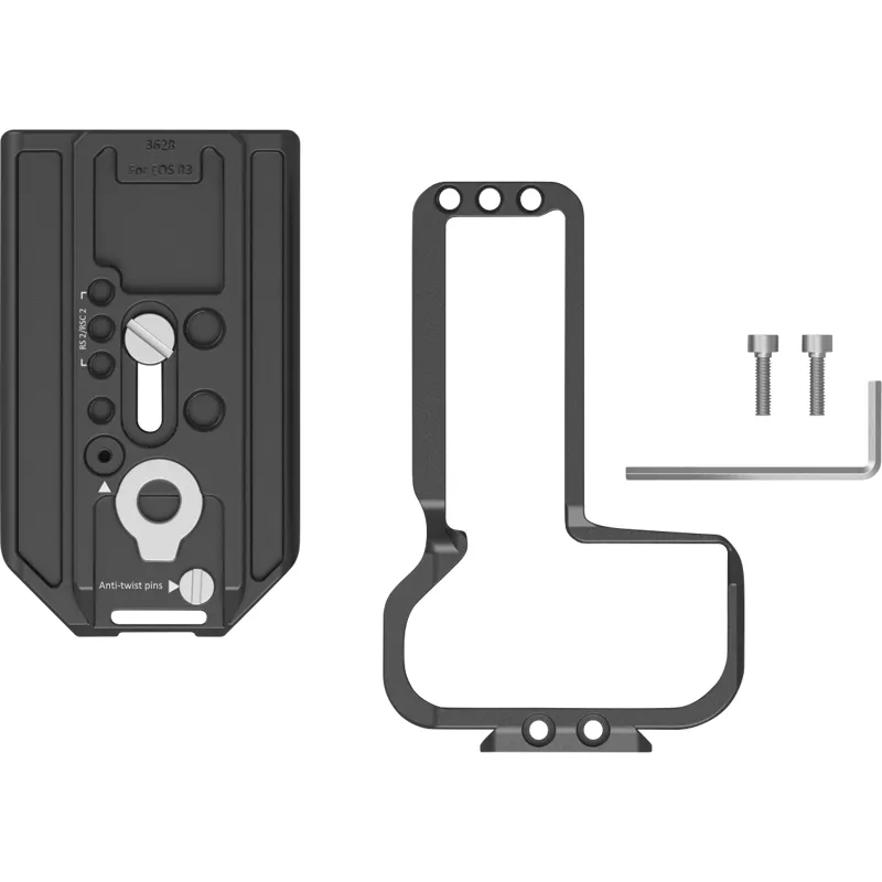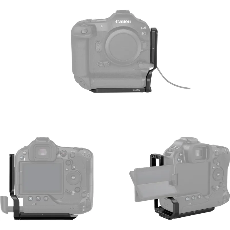 SmallRig L-Bracket for Canon EOS R3 3628 is designed for quick switch between horizontal and vertical shooting. It is locked into the bottom of a camera via a 1/4"-20 screw and an anti-twist screw, fitted with a silicone pad to prevent scratches and deflection, and can be disassembled into an Arca-compatible base plate (used separately) and side plate, both with lens center mark. The L-Bracket does not block ports, buttons and even allows the flipping of LCD screens to a certain extent. You may replace the battery without removing the L-Bracket and is also RS-80N3 compatible. Extendable side plate leaves room for HDMI and USB cables; base plate featuring mounting points such as 1/4"-20, 3/8"-16 threaded holes and wrist strap holes supports quick release plate, tripod, and the quick-release plate (pad) of DJI RS 2/RSC 2 stabilizers, etc. In addition, a slotted screwdriver is accessible for easy disassembly and assembly.