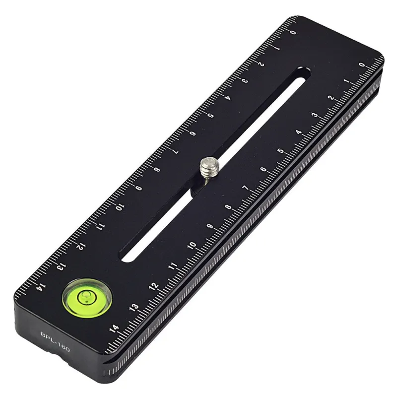 The Caruba Tripod Plate Universal WP160 is an universal quick release plate with a length of 16 centimetres suitable for SLR cameras. The plate has a 1/4" screw with which it is attached under the camera. The WP160 has a scale on the top and side. With the handy spirit level on the top, you can adjust the equipment precisely.