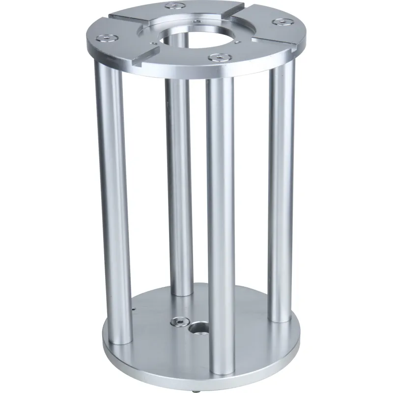 This is a 12-inch high Mitchell camera riser, designed with a Mitchell female mount on top and a Mitchell male mount on the bottom. It features three solid aluminum rods, each measuring 25mm in diameter.