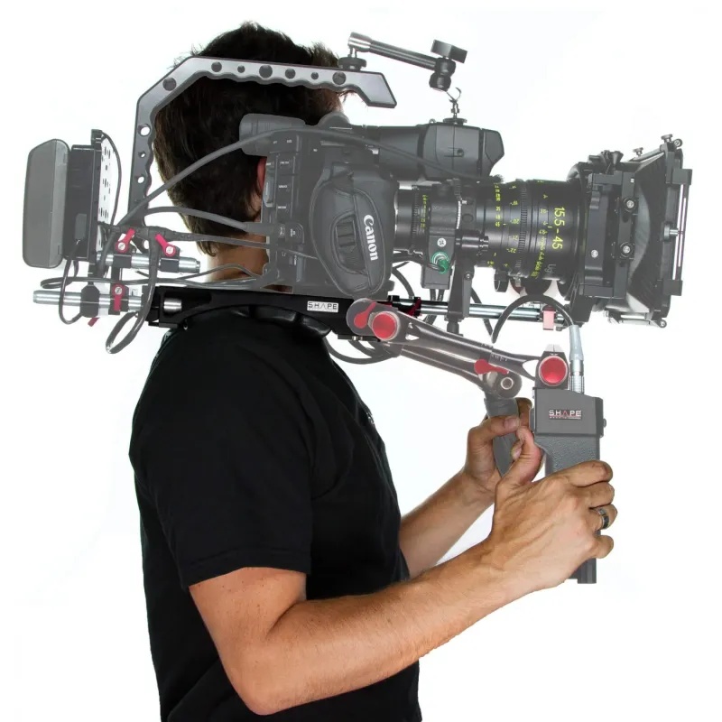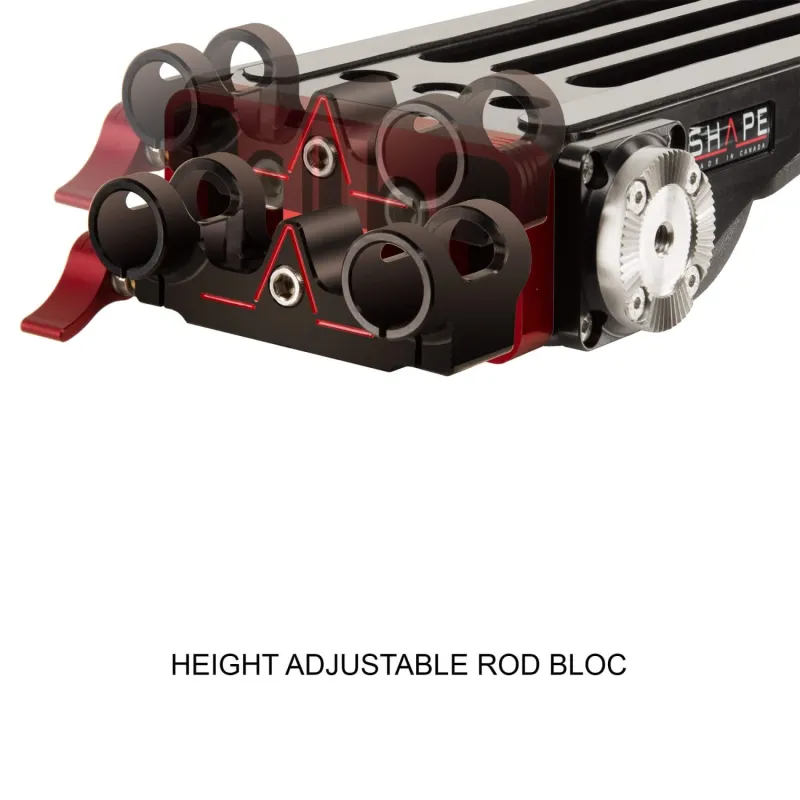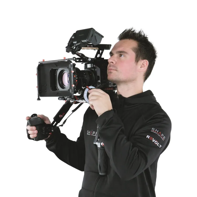 The shoulder pad secures on by touch fasteners. The tripod mount threads are located underneath the shoulder pad. Two pairs of 8″ and 4″ 15 mm rods are included for the front and back. For attaching a matte-box and other accessories, the rod adapter can be adjusted vertically if you remove the screw holding it in position. This baseplate also supports optional SHAPE 15 mm Studio and 19 mm Studio adapters in place of the included one. The baseplate features three camera mount slots, all supporting 1/4″-20 and 3/8″-16 screws. The off-center slots allow you to mount your camera offset if you use a 15 mm Studio Adapter. Multiple 1/4″-20 and 3/8″-16 mounting threads are peppered behind the three slots for attaching articulating arms and other accessories. Two 1/4″-20 and two 3/8″-16 camera mount screws are included.