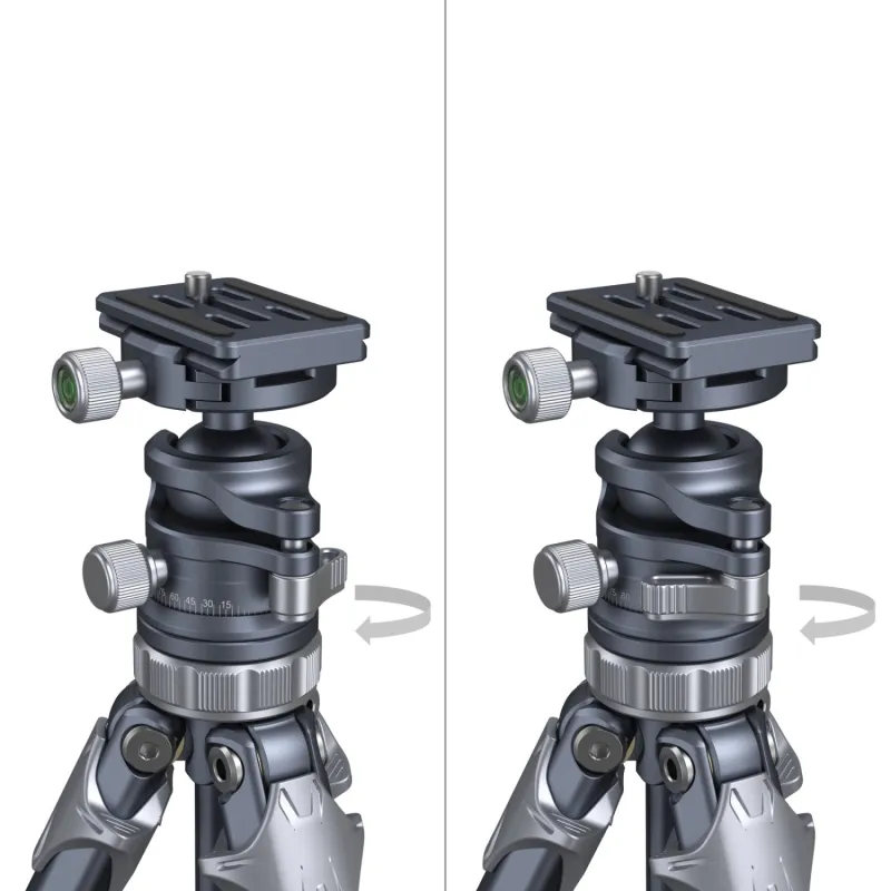 The included ball head has a locking lever for making fast adjustments plus an independent locking knob of its panoramic base. It has an Arca-type quick release clamp with classic locking knob and includes a quick release plate. The ball head also has two bubble levels for precise positioning.