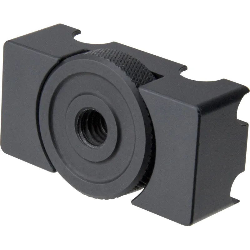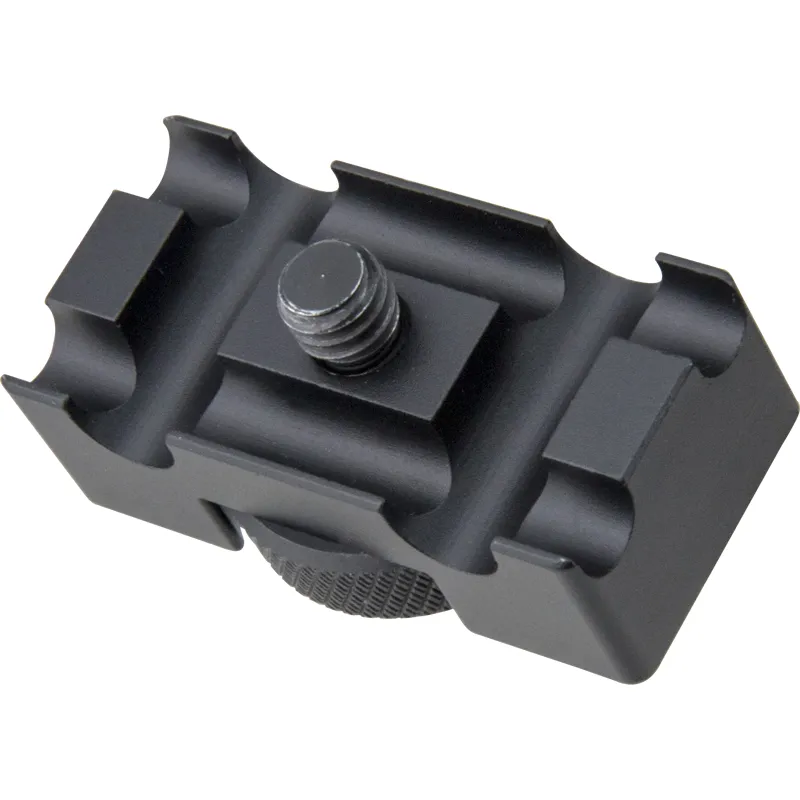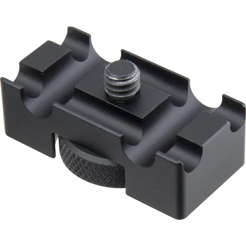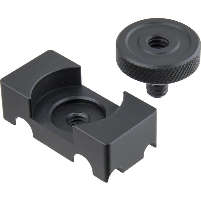 Constructed from aluminum alloy with a black anodized finish, the cable anchor adapter features grooves on the top designed for mounting cables to prevent damage to the data port of the camera. It comes with a 1/4-20 screw on the top for mounting this adapter on the camera, and a 1/4-20 screw hole in the bottom for connecting with the quick release plate of a tripod.