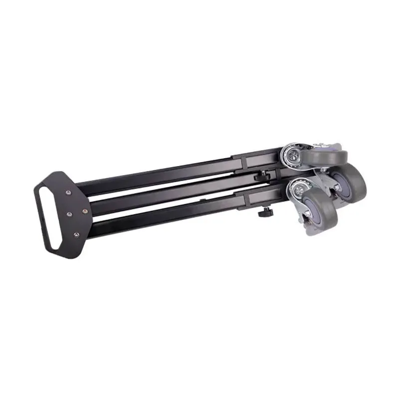 Every wheel got its own lock. You only have to step on the lock that is placed on the wheel, once you have the dolly on the place where you want it to be. De dolly also features feet handles that slide along de dolly feet and move easily closer to the middle or the end. With this you can create the desired spread of the tripod.