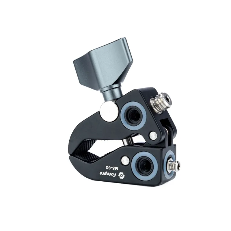 The Fotopro MS-62 Clamp is a universal, portable and stable clamp. The clamp has a maximum load capacity of 18kg, has 8 screw holes for extensions (6x1/4" and 2x3/8") such as for clamping to the table, bike or to your tripod. It is therefore multifunctional in use.
