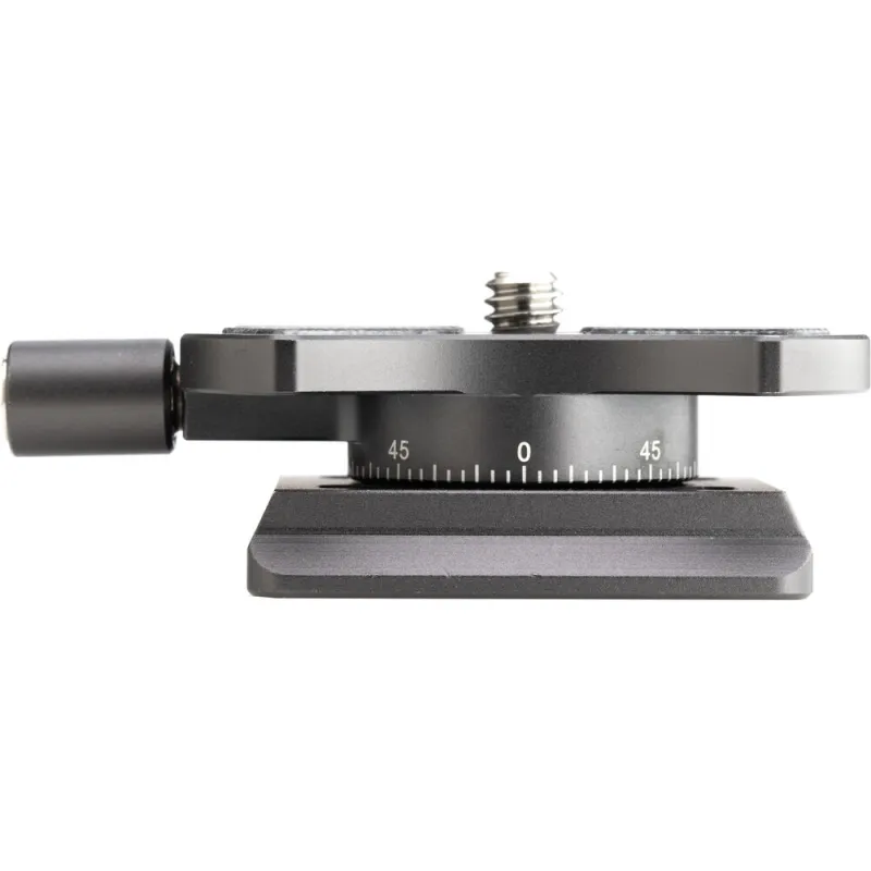 The rotating camera mount features a locking lever and a numbered scale for precise, repeatable results. The 1/4"-20 camera mounting screw may be tightened using the D-Ring, a hex wrench, or a coin.