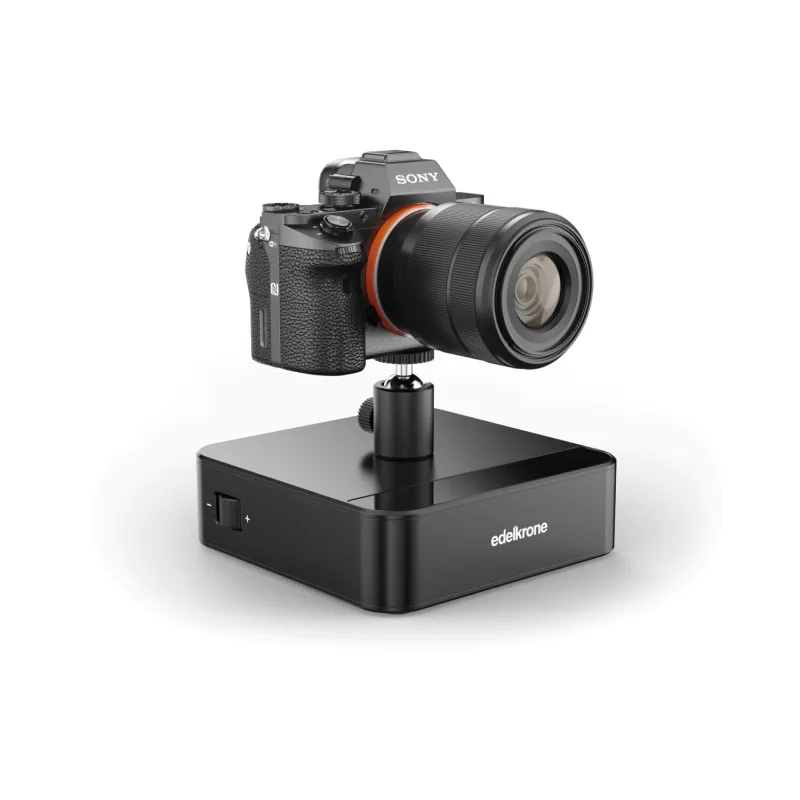 The edelkrone DollyONE is a portable robotic dolly that allows both linear and circular motorized camera moves on flat interior surfaces. It has a load capacity of 15 pounds. No track or measuring is required. The DollyONE is well suited for table-top or low-angle shots where you need the camera to be just a few inches above the surface.