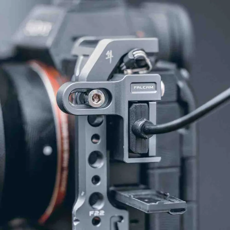 The Falcam 2977 F22 Camera Quick Release Cable Clamp is made of aluminium and protects the cable port of the A7 series cage.