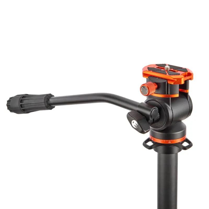 The detachable panning arm can be adjusted with a dedicated wing knob, and the head features leveling levels in both the base and clamp.
