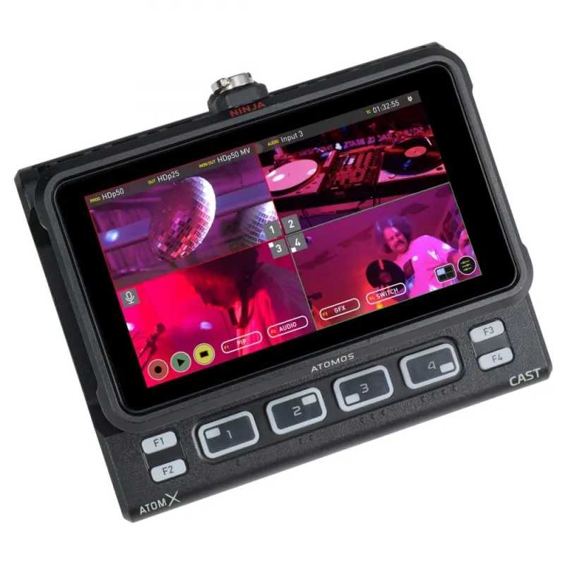 AtomX CAST is a modular companion for the Atomos Ninja V or Ninja V+ monitor-recorder that uses the AtomX expansion port on the Ninja V/V+ to transform it into an advanced multi-input switcher. The combination of the Ninja V and AtomX CAST becomes te Ninja CAST, a fully functional stand-alone switcher, muliview-monitor and broadcast quality recorder that does not require a computer to function. With a high quality 5" HDR touchscreen monitor, 4x HDMI inputs and physical buttons, the Ninja CAST is the ultimate portable live switching and streaming solution.