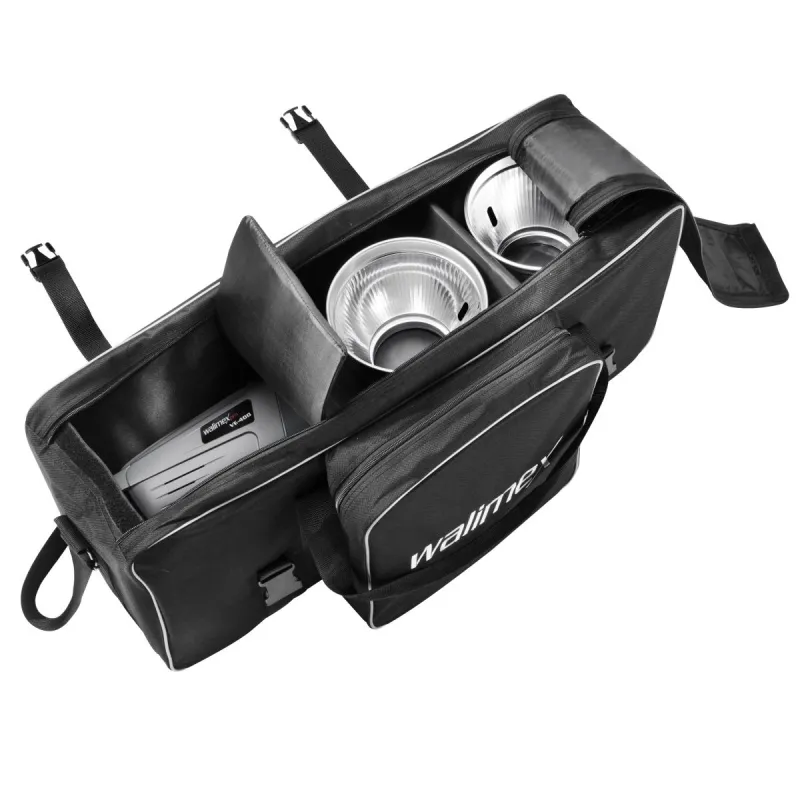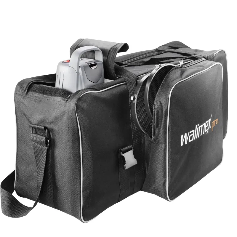 Walimex pro Studio Bag XL užtikrina puikią jūsų įrangos apsaugą ir puikiai tinka transportuoti blykstes, pvz., walimex pro VC serijos. Nuimamos pertvaros yra paminkštintos ir leidžia laisvai organizuoti vidinę erdvę pagal jūsų individualius poreikius. Papildomi priedai gali būti laikomi dideliame priekinėje kišenėje, o naudojant tvirtinimo diržus, stovai taip pat gali būti pritvirtinti prie maišo.