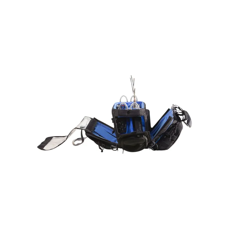 There are two extra pockets, one at the front for storing headsets, cables, batteries, etc. and the back pocket can hold a small battery.