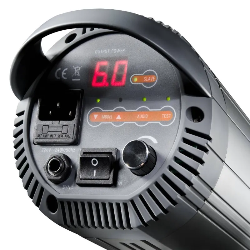 The highlights of this series include the built in 2.4 GHz receiver with 16 channels and 4 groups. When used with several flashes, each flash can thereby be separately controlled - for higher flexibility. All settings, like flash power or modelling light, can be conveniently made via the separately available radio remote trigger, but also by using the clearly arranged and user-friendly control panel on the flash itself. The power can be regulated from 1/1 to 1/32 and is, just like the 150W modelling light, infinitely and proportionally adjustable, whereby the light power can be exactly adapted to the prevailing lighting conditions. All settings are perfectly readable on the LED-display. The flash can be triggered via a Sync Cord, the built-in photo cell, via the test button or via the additionally available convenient radio remote trigger. A very strong cooling fan protects against failure caused by overheating.