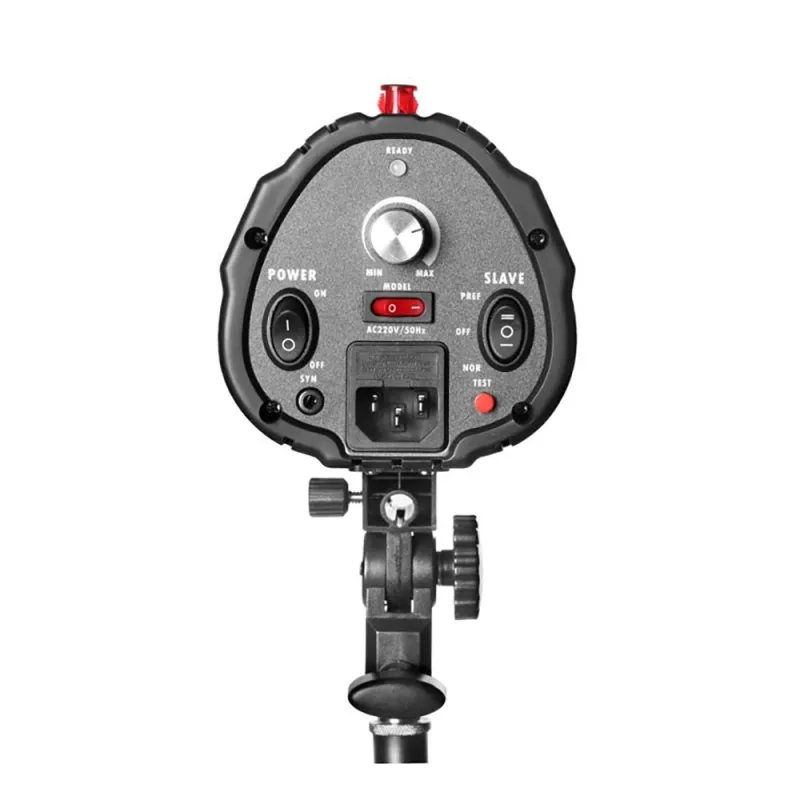The studio flash head is equipped with a buzz-function. And unlike the anti-preflash models, this series can control cameras equipped with a single flash anit-preflash system to flash simultaneously on the second flash. The modeling lamp can be set from full power to 1/8 and works the same as in the larger studio flash units.