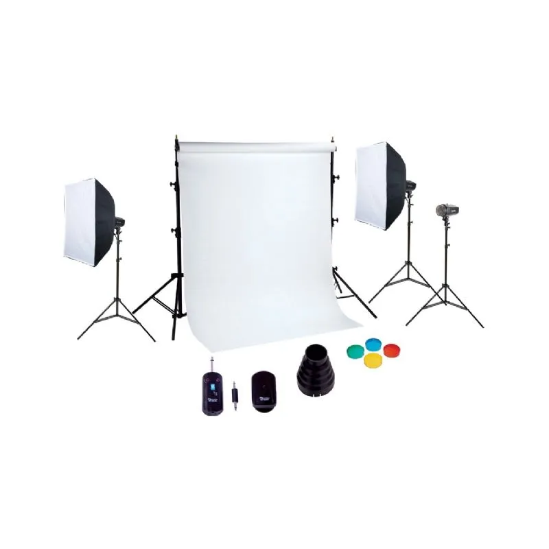 ;The SSK-3150D studio flash set contains 3 flash units, 3 stands and 2 foldable soft boxes of 50 x 75 cm, so you can start immediately. The backdrop set consists of a backdrop system and a white and black backdrop cloth (2 x 3 m.). Furthermore, a variety of handy accessories are included: a wireless trigger set, in order to trigger the set wirelessly, a set of color filters and a conical snoot. There are other optional accessories available for the SS flash units such as a barn door set, honeycomb and various sizes soft boxes. These accessories can be found under Optional Accessories .