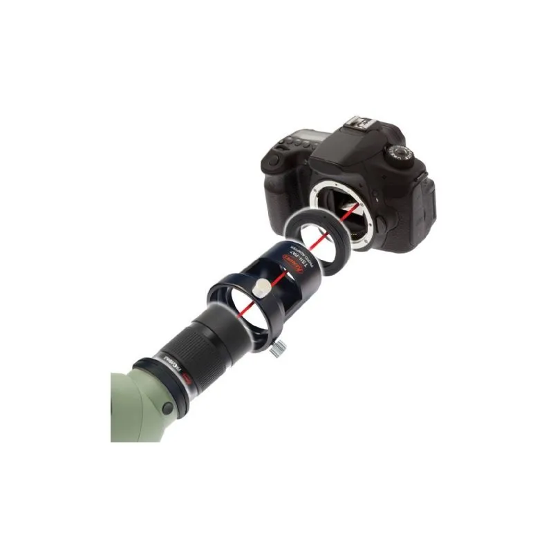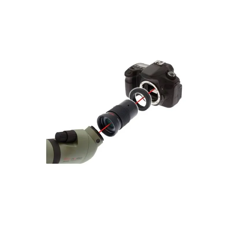 If you prefer to connect the whole thing to your camera lens, this is no problem either. You then need a Kowa adapter ring in addition to the TSN-DA10 that fits the filter thread of your camera lens. Kowa has the following available sizes for this: 28, 30, 30.5, 37, 43, 46, 58, 62 and 72mm. If your camera lens has a different filter thread, a step-up or step-down ring can be used without any problems. Ask about the possibilities.