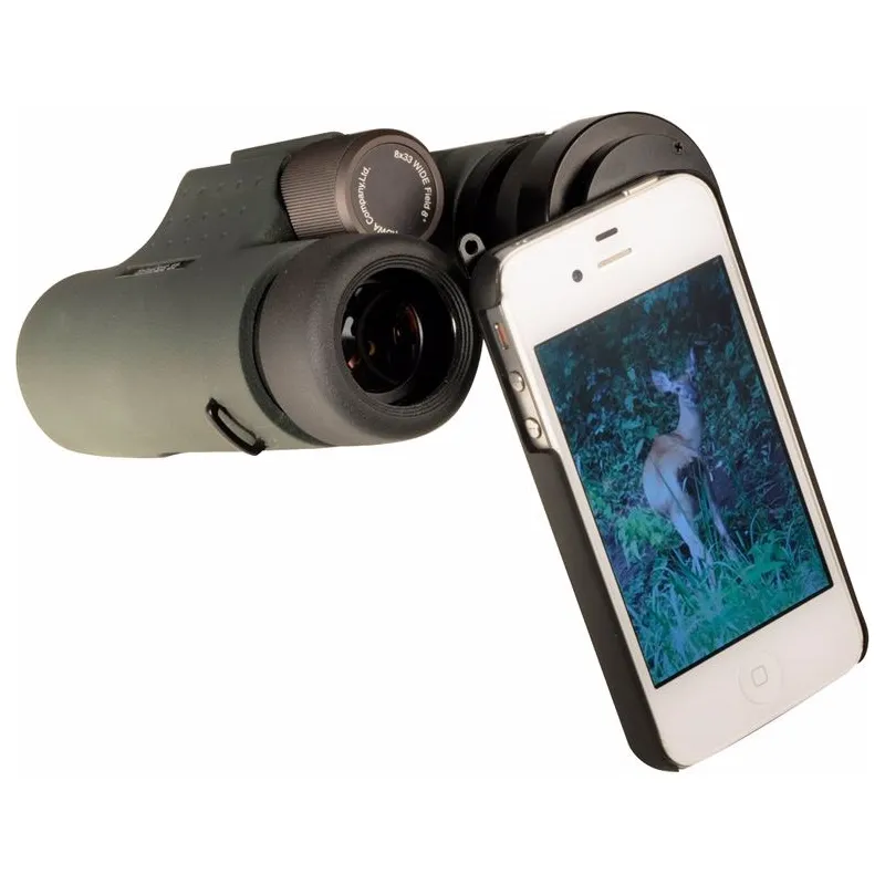 The Kowa Photo Adapter for iPhone 5 allows you to effectively use a Kowa spotting scope or binocular as a telephoto lens for your smartphone. The powerful magnification and premium optical components of your spotter enable long-distance photos or video (which you can then share directly from your phone). This adapter includes a phone case and 41mm and 55mm adapter rings; simply screw on the correct ring, press the ring over your spotting scope eyepiece or one of the eyepieces on your binocular and focus with the spotter's or binocular's focusing rings. It is strongly suggested that you use a tripod and remote shutter release for a sharply focused image. Depending on the specific model Kowa eyepiece or binocular that you wish to use, a different, separately sold adapter ring may be required.