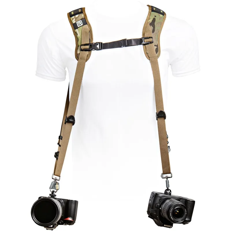 With this BlackRapid Double Camera Harness, you can carry two cameras at the same time, one on the left and one on the right. Even when you have two heavy cameras with lenses attached, the wearing comfort of the harness remains very high. This is due to the resilient and breathable pads that protect your shoulders and back. The breathable properties of the pads prevent perspiration in warm conditions.