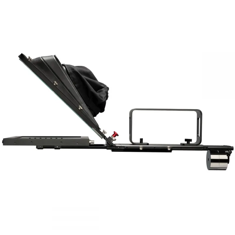 Our professional line teleprompters not only include three different camera mount bases, but also counter weights to allow for a large range of different sized cameras to work. The base can conveniently slide to adjust the weight without the need to remove the plate.