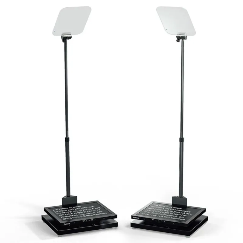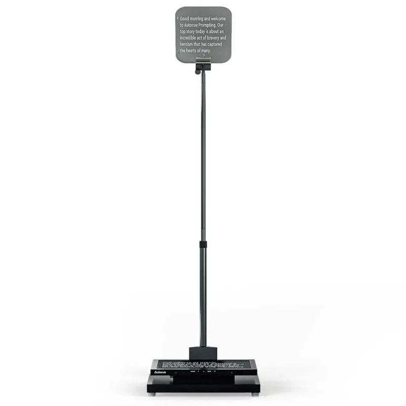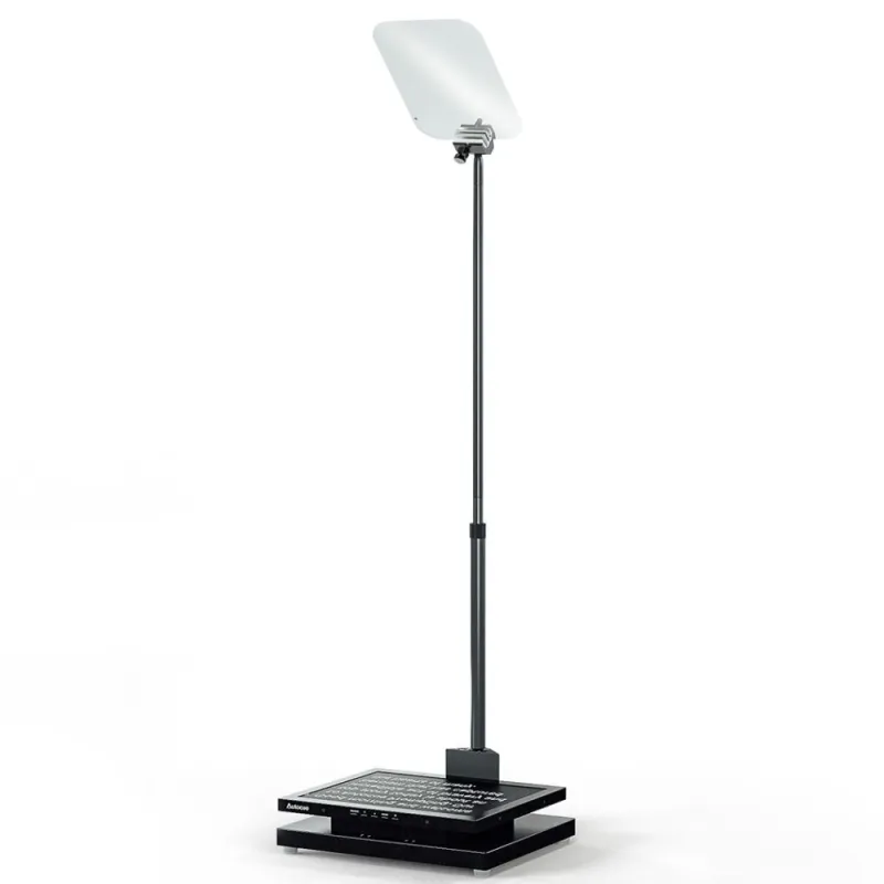The monitors have a metal housing that’s lightweight and tough enough to survive for the long-haul. Simply rest them on the base of the conference stands and use the included adaptor to run an SDI cable to each one. The conference stand poles can be adjusted to place the glass at the perfect height to make the script visible to the speaker and you can be confident it will remain unseen by the audience thanks to Autocue 70:30 beamsplitter glass.