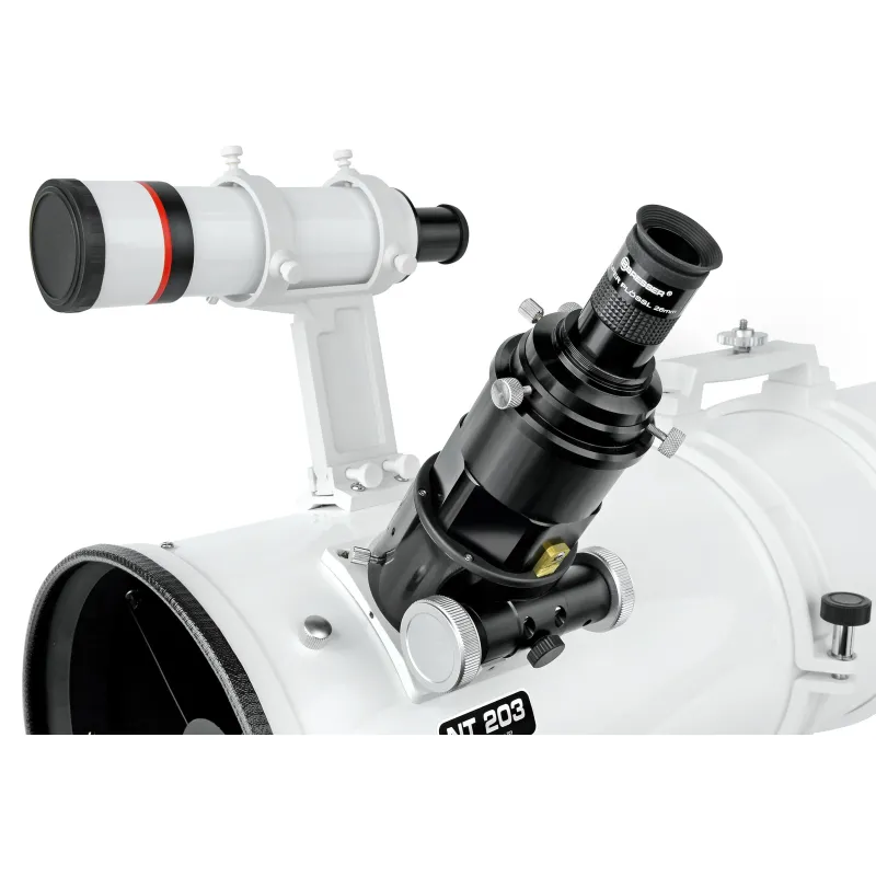 In the past few years the Bresser Newton telescopes have become the standard workhorse for Deep Sky astrophotography. We now proudly present the second generation of this telescope, the Bresser NT-203s/800 with Hexafoc and a fast parabolic main mirror. The Bresser NT-203s/800 f3.9 will deliver you deeper images due to its - compared to 8" f/5 systems - oversized primary mirror and therefore faster optical system with the same exposure time. The big 85 mm secondary prevents vignetting for optimal illumination The excellent 2.5" Hexafoc focuser also does not cause vignetting due to its large diameter and makes focussing a joy - the smoothness and shifting-free operation sets new standards in this price class. This groundbreaking focuser, tube rings with 44mm universal standard dovetail and camera mounting feature and a high-end finderscope with haircross and laser-engraved scale leave nothing to desire even for demanding astrophotographers. The NT-203s/800 Hexafoc has a classical tube construction with an aluminium tube. The focuser can be upgraded with a 10:1 reduction (part No. 0625720) without problems. Ready to use with the HR Coma Corrector (part No. 0510330) which eliminates coma, field-curvature and astigmatism.