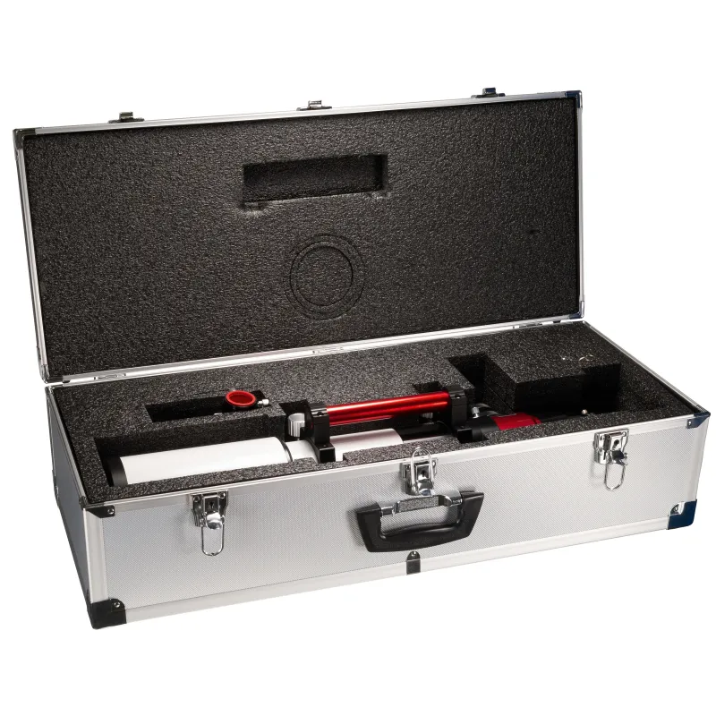 The LS100MT/B1800 is a complete telescope for observing the sun in H-alpha light, with 100mm free aperture (no central obstruction) and 714mm focal length . The H-alpha wavelength is the most impressive way to observe the sun, showing protuberances at the sun's edge, filaments and flares on the surface, and much more. An internal Etalon filter achieves a bandwidth of <0.7 Angstrom with the innovative air pressure tuning system Pressure-Tuner . Tuning is done by slightly changing the air pressure in a pressure chamber inside the telescope. This changes the refractive index of the air, making it easy to tune to the H-alpha line. The pressure tuner guarantees a homogeneous image, without central obstruction, and a permanently protected Etalon without erosion. A set of collimating lenses installed in the telescope ensures best performance.