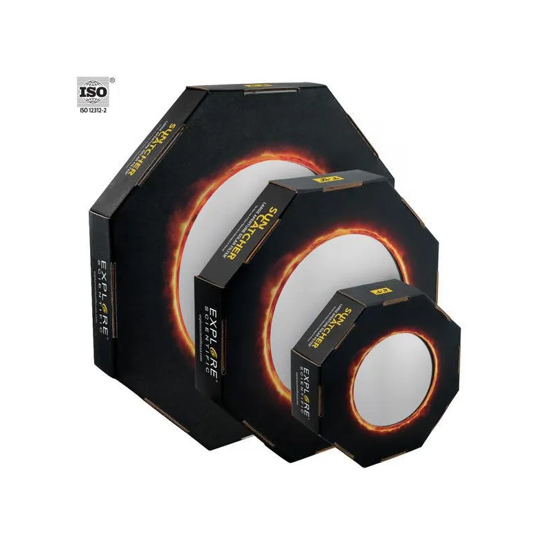 Explore Scientific's Sun Catcher Variable Large Aperture Solar Filters are available in many sizes to work on most telescopes from 60mm up to 10-inch Schmidt-Cassegrain and of course all Bresser and Explore Scientific Telescopes. The Solar Filter material being used is the new advanced 'Solarlite' Film manufactured by world famous Thousand Oaks Optical through years of research and development. 'Solarlite' a new solar film that has the optical quality of glass with the advantages of impregnated polymer. Perfect also for the solar astrophotographer.