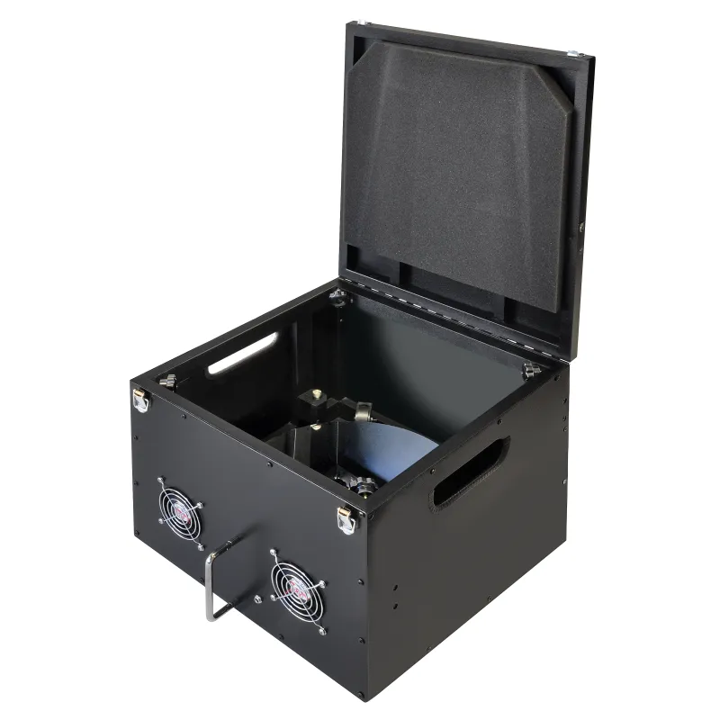 - Secondary unit and altitude wheels fit into the rocker box and the mirror box includes a cover for transport so that the whole telescope breaks down into only two aluminium cases and the trusses