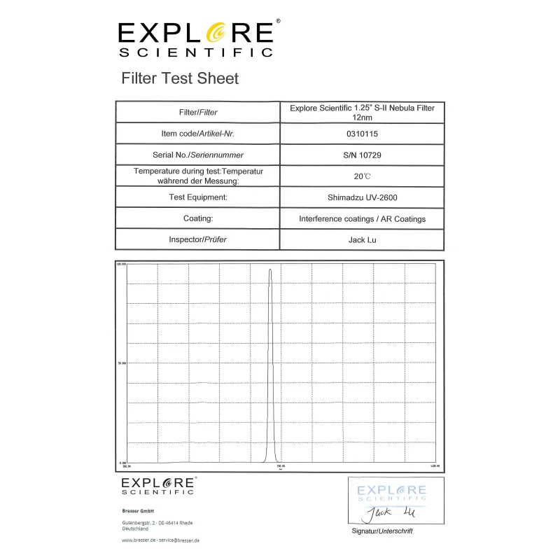 EXPLORE SCIENTIFIC nebula filters come with an individual test report - so you can be sure to get high quality filters.