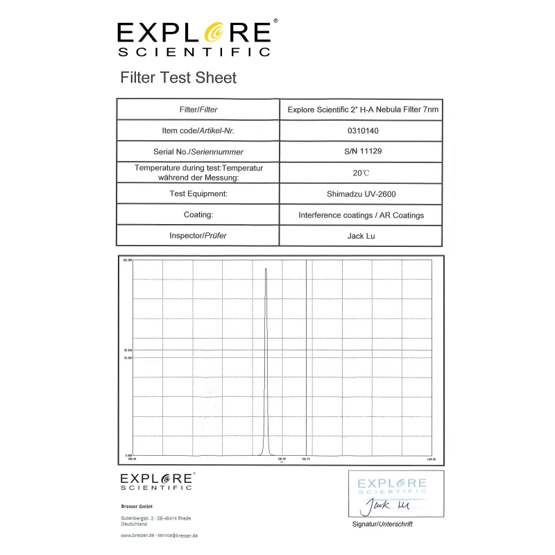 The EXPLORE SCIENTIFIC nebula filters are delivered with an individual test report - so you can be sure to get high quality filters.