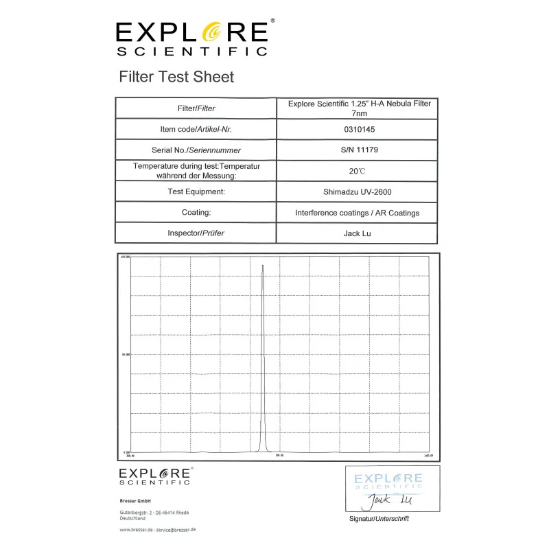 The EXPLORE SCIENTIFIC nebula filters are delivered with an individual test report - so you can be sure to get high quality filters.