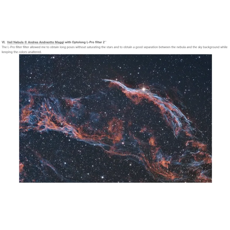 Suitable for visual observation and astrophotography. L-Pro filter has a very low transmission reduction rate against continuous spectrum space objects, and thus is quite effective in suppressing light pollution sources when shooting galaxies, reflection nebulae and globular star clusters. The same holds true for visual star observations. L-Pro filter alone can suppress infrared wavelength, and thus can be used at ease for ''L'' image shootings with CCDs. Light pollution filters do not eliminate the effects of light pollution or increase the object’s brightness. In many cases, they increase the contrast between nebula and night sky, not brightening the nebula.