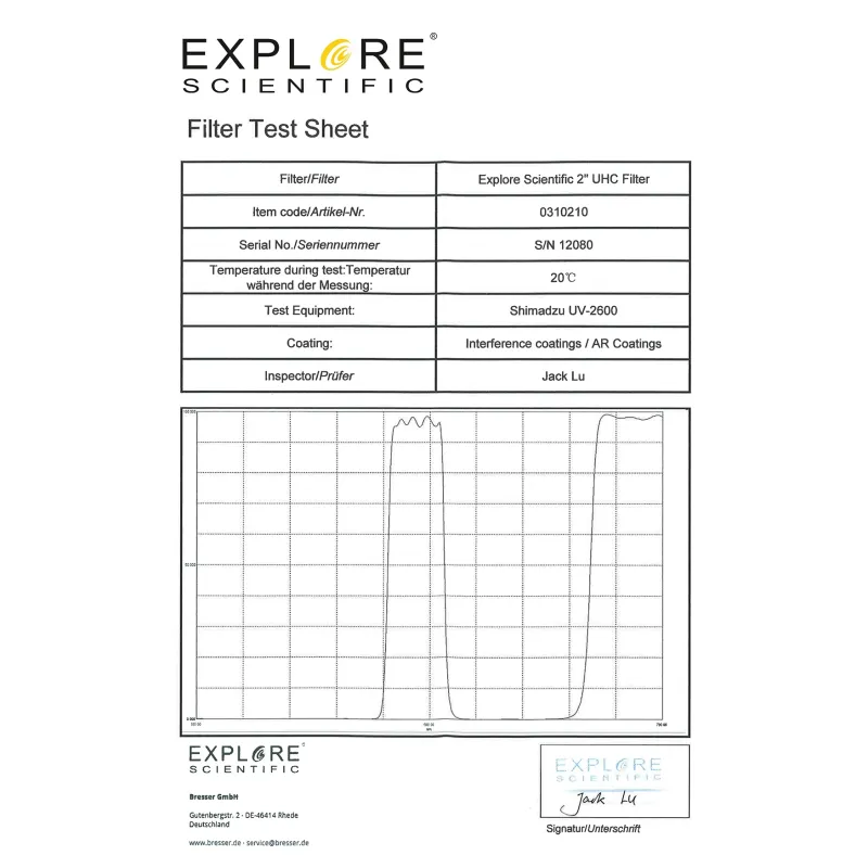 One of the most important obstacles for the exploration of the night sky is the brightening of the night sky by artificial lights, such as streetlights. The night sky is not really dark in the vicinity of towns or cities, which reduces the visibility of objects beyond the solar system enormously. Depending on the type of the celestial object, it is possible to dramatically increase the contrast by blocking annoying artificial light. The EXPLORE SCIENTIFIC UHC filter "zeros in" on the wavelengths of so-called emission nebulae. Those objects glow in special colours - their emission lines. Those emission lines are linked to chemical elements - in this case hydrogen at 486nm and 656nm, plus oxygen at 496nm and 501nm. The EXPLORE SCIENTIFIC UHC nebula filter blocks all other colour wavelengths (and thereby nearly all of artificial light) and only the emission line of the hydrogen and oxygen can pass the filter. The result is astonishing: suddenly nebulae are visible at locations that were completely invisible from, without filters. In suburban skies, for example the Owl-nebula M97, the Veil-nebula NGC 6992 or even the bright Dumbell-nebula M27 are not clearly visible. Using this filter allows you to see nebulae and their structures in much finer detail. A must for every visual observer. The Explore Scientific nebula filters come with a individual test certificate - your guarantee to receive a premium filter.