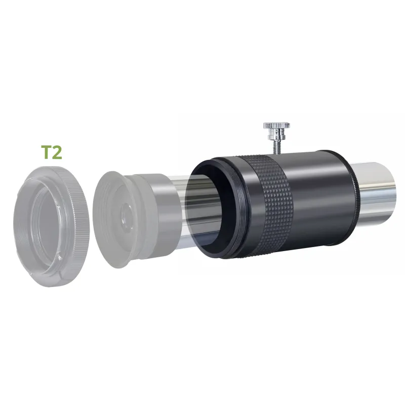 The BRESSER Telescope Camera Adapter is the connecting piece between your 35 mm DSLR camera and the telescope. The connection to your camera can be achieved with the fitting T2-mount (T2-mount optional). For the focal fotography, you need to unscrew the bottom part of the adapter and attach the camera with the fitting T2-mount directly to the push-on contact. The eyepiece projection is possible when you put an eyepiece into the adapter and tighten the knurled screw. After that, you have to attach the T2-mount and the camera and you are ready to go.