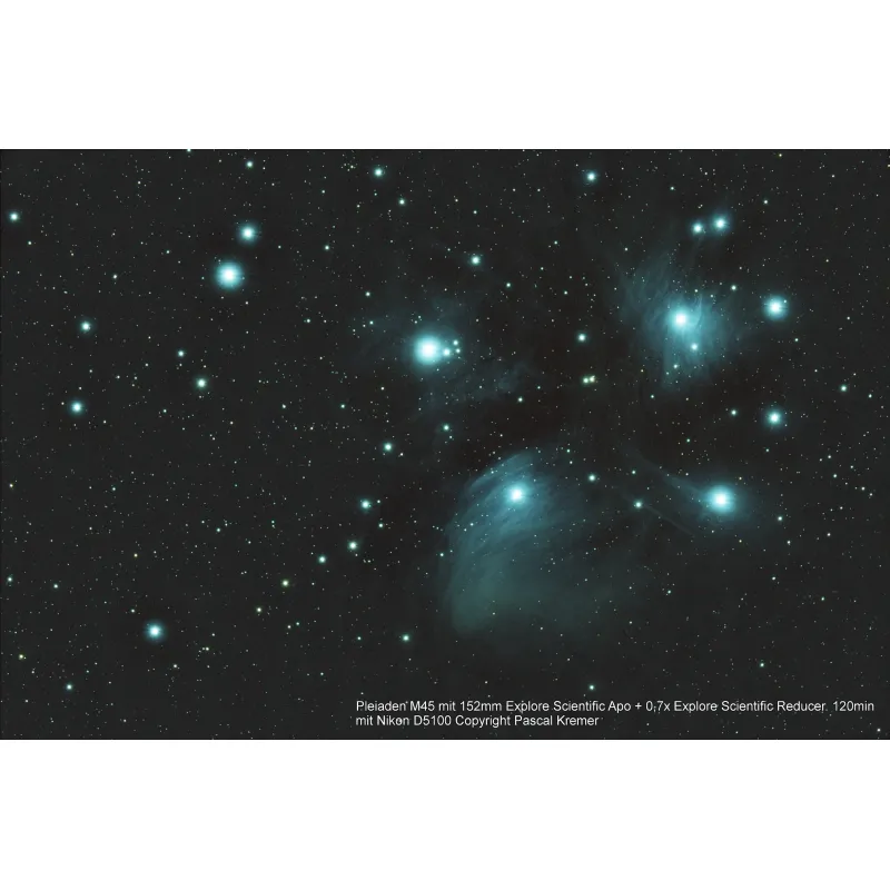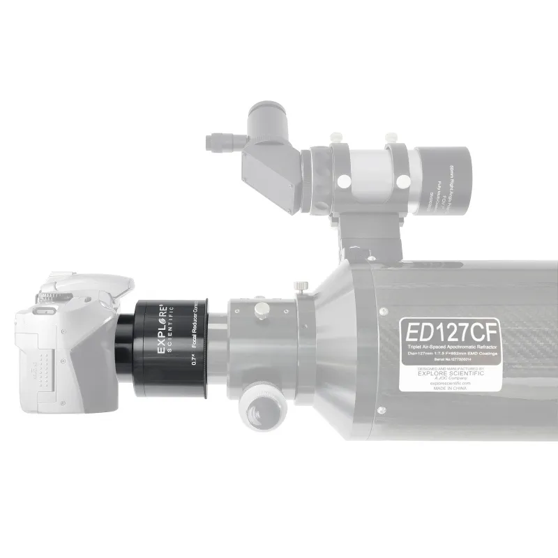 The EXPLORE SCIENTIFIC 3" 0.7x Reducer/corrector, reduces a compatible telescope's focal length by a factor of 0.7x (for around f/8) and 0.8x (for around f/10) respectively. The reducer/corrector not only reduces the focal length but also flattens the field . Although originally developed for the Explore Scientific ED-APOs 127mm and 152mm , the reducer can be used with many systems - for example with the Explore Scientific ED-APOs 102mm and 165mm (please note, this will not work on the Explore Scientific 80mm ED Apo refractors though). With certain telescope focal lengths, a slight restriction of the correction at the edge of the image field can be expected when using full-frame sensors. This unit comes with 3" barrel adaptor for direct focuser thread M54x0.75 (the standard focuser thread of the Explore Scientific Essential series of ED Apos) and T2 camera adaptor. This reducer/corrector features a free aperture of 65mm , so that it can be used even with cameras that have a large sensor - if the telescope allows for this.