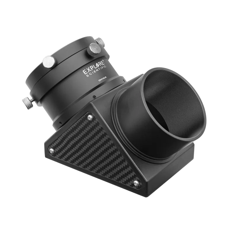 Star Diagonals provide a user-friendly observing position for refractors and Cassegrain telescopes. The 3" Explore Scientific Diagonal Mirror is precision machined from aluminium and contains carbon fibre parts. The large diameter of 3"(76.2mm) is ideal for modern wide angle eyepieces, such as our 0218430 EXPLORE SCIENTIFIC 100° Ar Eyepiece 30mm 3" , which (thanks to the size of this diagonal) can be mounted in suitable instruments, without vignetting occurring. The dielectric coating delivers 99% reflectivity and is very durable against environmental influences. A reducer to 2"(50.8mm) is included. We offer adaptors for a wide variety of focusers. Please call or email us for prices and availability of these adaptors. The required light path of the diagonal mirror is 170mm . Telescope side connection thread after removing the 3" sleeve is an M75 x 0.75 female thread .