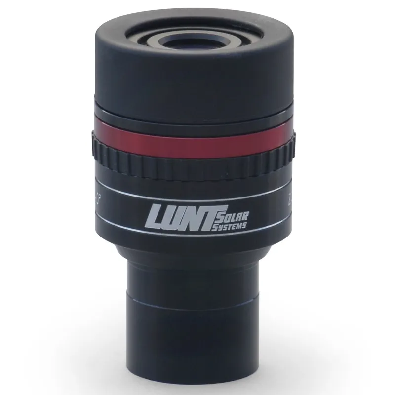 The special of this zoom eyepiece is that the optical layout offers highest quality views of the sun, but also on nightsky objects. LUNT minimized the reflections by using superb multicoatings and with care designed internal baffle system and blackened lens edges . The LUNT zoom-eyepiece is not the widest field zoom-eyepiece on the market, LUNT prefered best performance over widest field. The sun and stars are perfect pin point across the entire field of view without any visible distortion. The LUNT zoom-eyepiece is almost parfocal , from one end to the other end of the zooming way you need only 0.5mm to refocuse. The LUNT zoom-eyepiece has a very nice height adjustable eyeguard to protect your eye against day light reflections and to help you to find the perfect eye position.