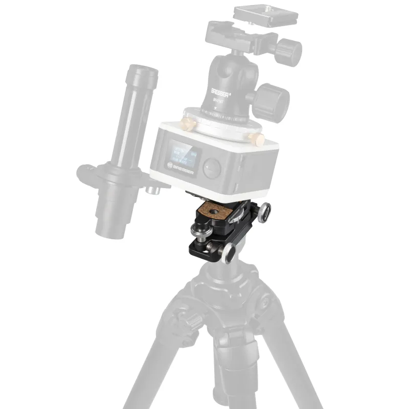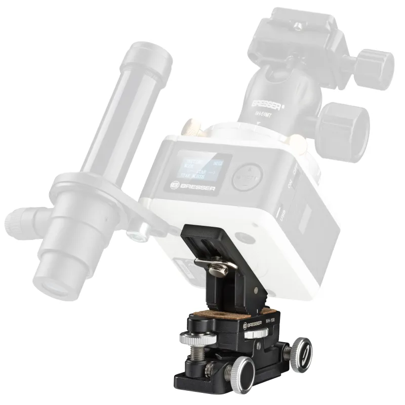 The BRESSER Micro Motion Head MH-100 allows a very precise adjustment by using large dimensioned knurled screws. In order to keep the adjustment distances by using the knurled screws as small as possible, the mounting plate has a quick-release clamping device with toothing in order to be able to select a rough presetting of the pole height (latitude at the location). The Micro Motion Head MH-100 can be mounted on any photo tripod with 1/4 inch photo thread closure. The BRESSER StarTracker astrophoto mount can then be mounted on the MH-100 tripod head without the use of tools using a 1/4" photo thread screw. The complete motion head is made of black anodized aluminum and guarantees highest stability by the use of solid material. The knurled screws with fine pitch thread are even made of stainless steel and guarantee a long durability and corrosion resistance.