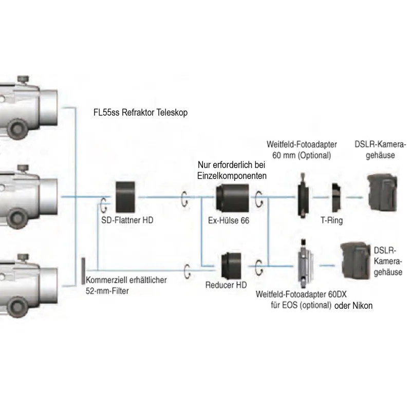 The FL55SSS turns into a fast F/4.3 astrograph with the optional flattener and focal reducer. It allows you to use extremely short exposure times and a provides a large field of view for large nebulae or comets .