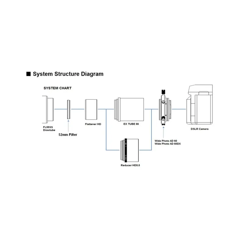 Converts the FL55SS into a high-performance astrograph The kit consists of a high-performance flattener lens, a reducer and the EX TUBE 66 connection ring, which was developed for the FL55SS Fluorite Apochromatic Refractor and improves photographic performance by dramatically flattening the surface.