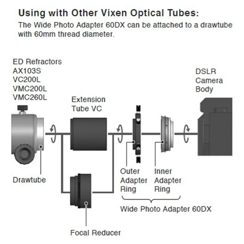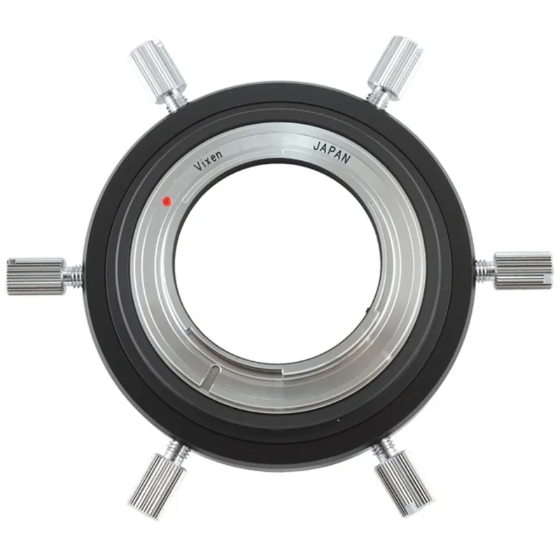 Vixen 60DX Focal adaptor for Canon EOS Cameras This Vixen 60DX is a photographic adaptor for Canon EOS cameras, for use with telescopes with a 60 mm focuser drawtube connection thread. A redesign by Vixen uses new tougher materials for a more solid connection and also offers an accurate, well-machined camera rotator ring, in order to help frame your images perfectly. Camera-Adaptor for Canon EOS with 60mm Focuser connection thread Large inner diameter for full-format cameras, helping to minimise vignetting 6 locking 60° spaced bolts to hold the camera’s rotation in position Dimensions: 81mm x 30 mm / weight: 190g The option of using 6 long or 6 short fixing screws for the rotator The Vixen 60DA Focal adaptor connects your Canon EOS DSLR Camera to a telescope with an appropriate 60 mm Focuser Drawtube Thread . Thanks to the use of new materials and an improved design Vixen was able to considerably uprate both precision and durability , when compared to conventional rotational camera adaptors.