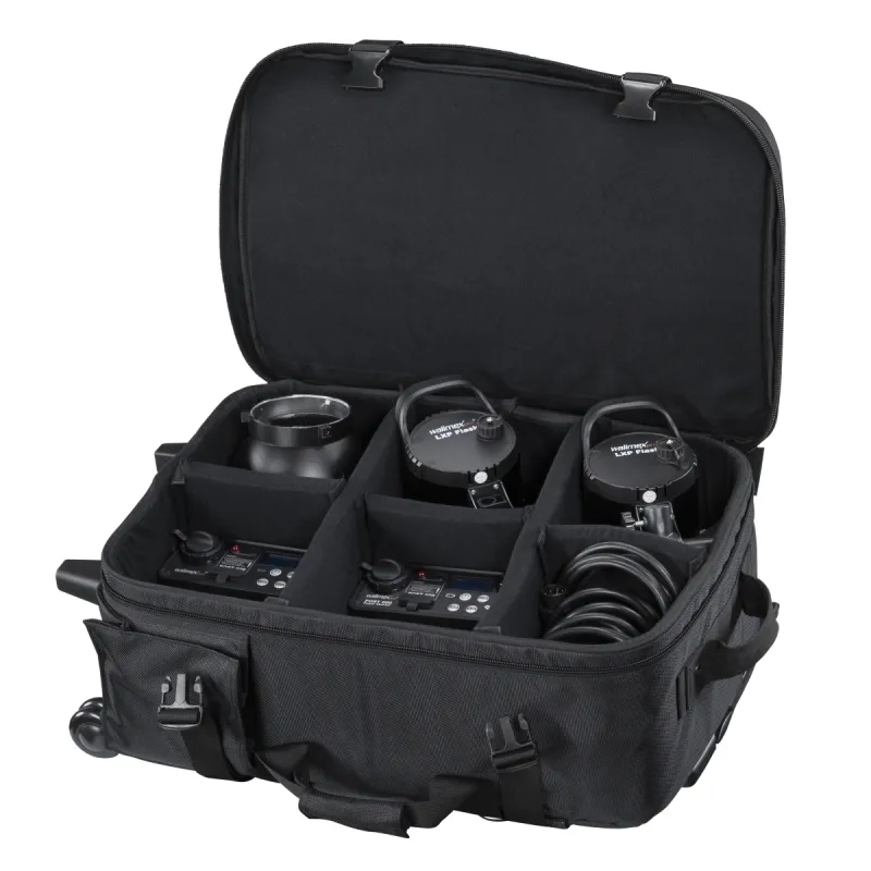 The studio bag can be pulled easily on smooth-running rollers, or carried with the padded multiple-stitched handles. You can attach monopods, travel tripods and even large tripods to take with you.