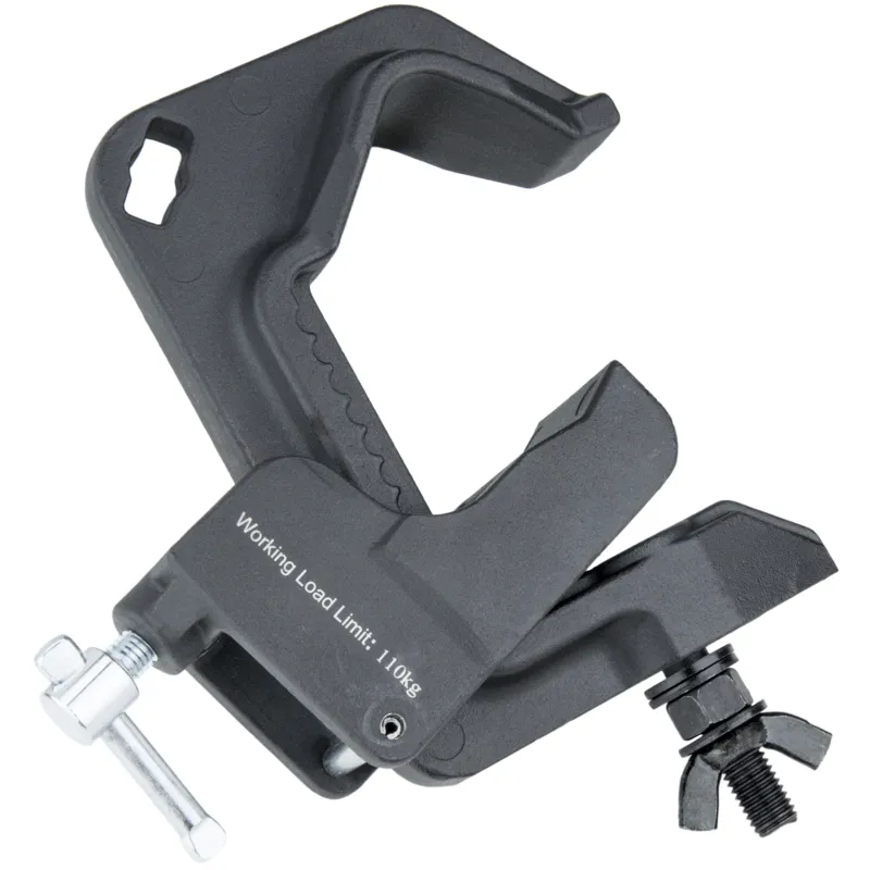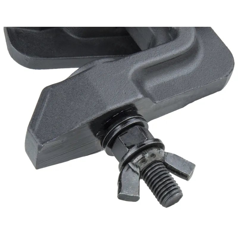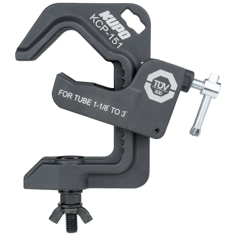 Also manufactured from rugged gravity cast aluminum, the Kupo KCP-151 Swiveling C Clamp comes with an M12 screw and wing nut instead of a universal head. The C clamp works for pipe diameters from 28 to 78mm with a load capacity of 110kg (242lbs).