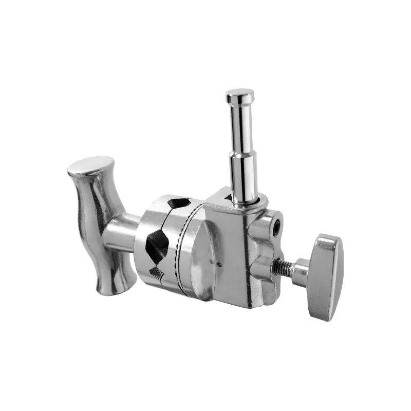 The grip head with a fixed baby pin allows one lighting fixture or accessory to be mounted on this grip head without the need for additional lighting stands.