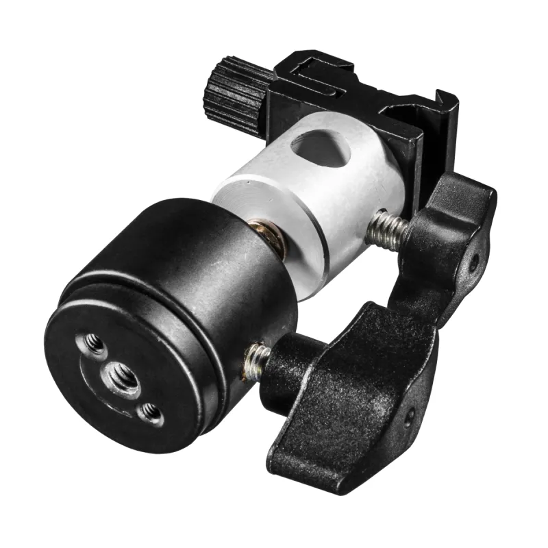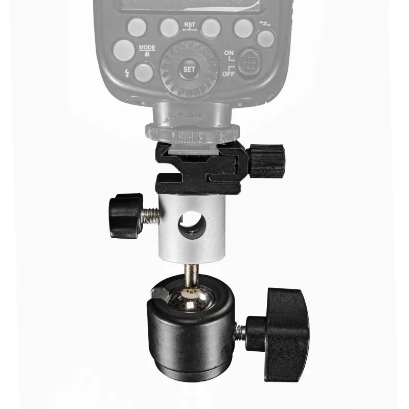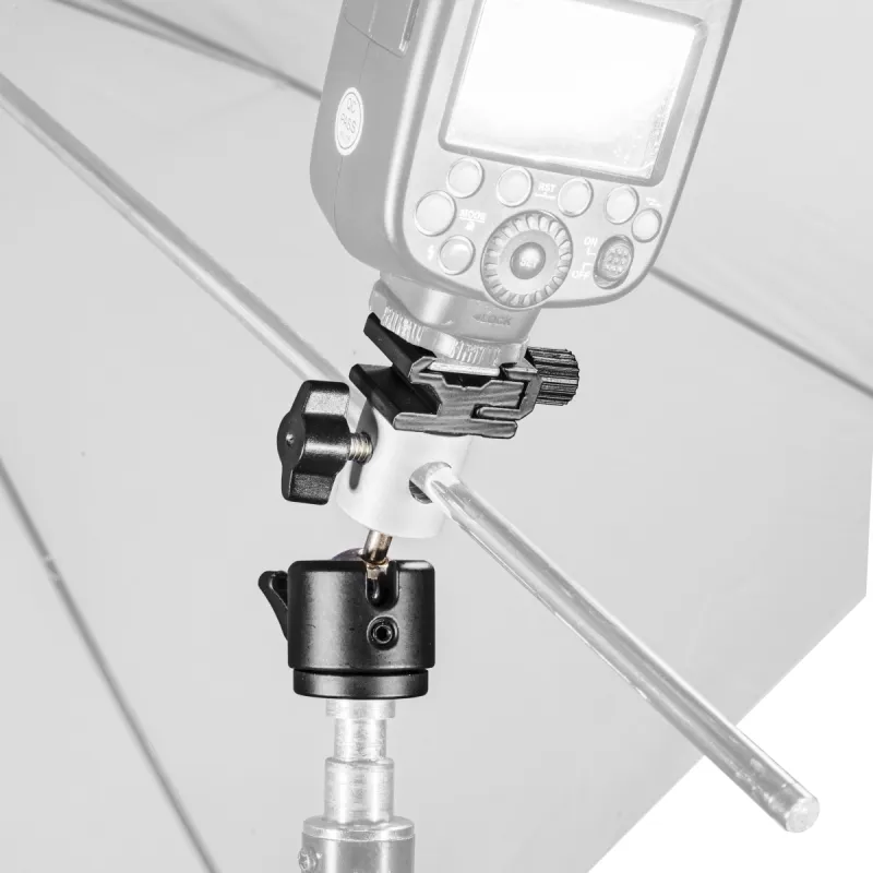 The umbrella and hot shoe holder with ball head has a 1/4-inch thread underneath into which, for example, a spigot adapter can be screwed. On the head piece of the adapter, there is an umbrella mount for umbrella part with a maximum diameter of 10 mm and a flash hot shoe mount that can take any usual system flash.