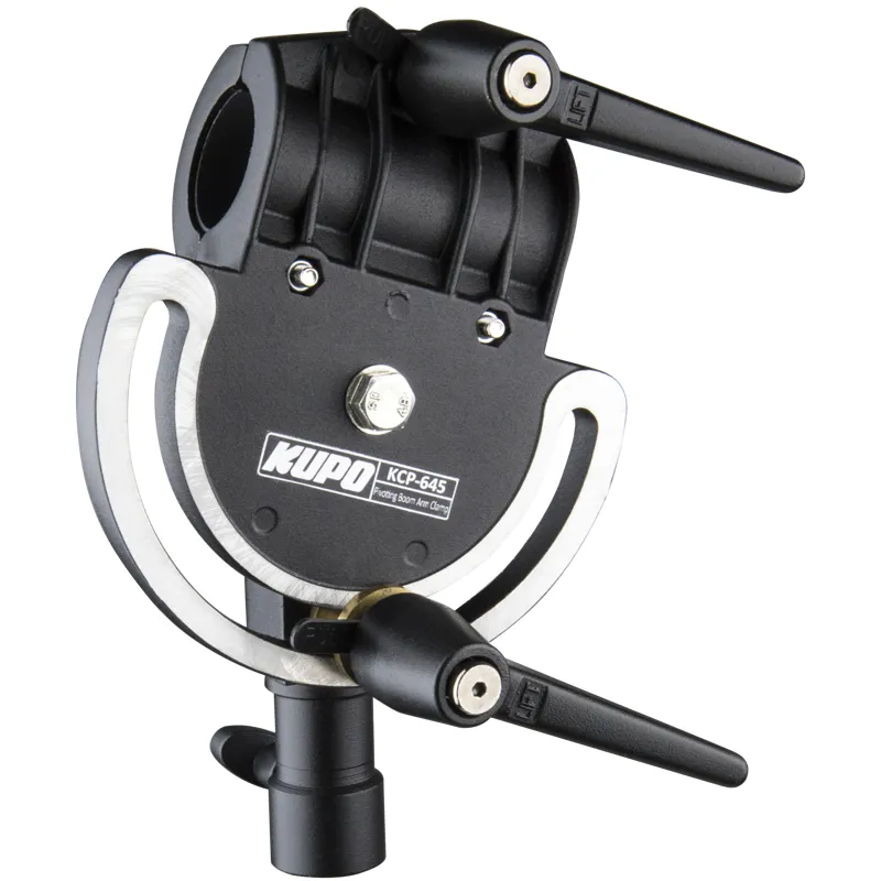 The Kupo pivoting clamp is constructed with solid aluminum die-casting and a plastic cardboard insert, allowing it to fit a wider tubing size from 30-35mm in diameter for the boom. With a 1-1/8 inch (28mm) male pin and a 5/8 inch (16mm) female receiver, the attachment of the clamp can fit into the junior receiver or mount on the baby pin, providing greater flexibility and adjustment.
