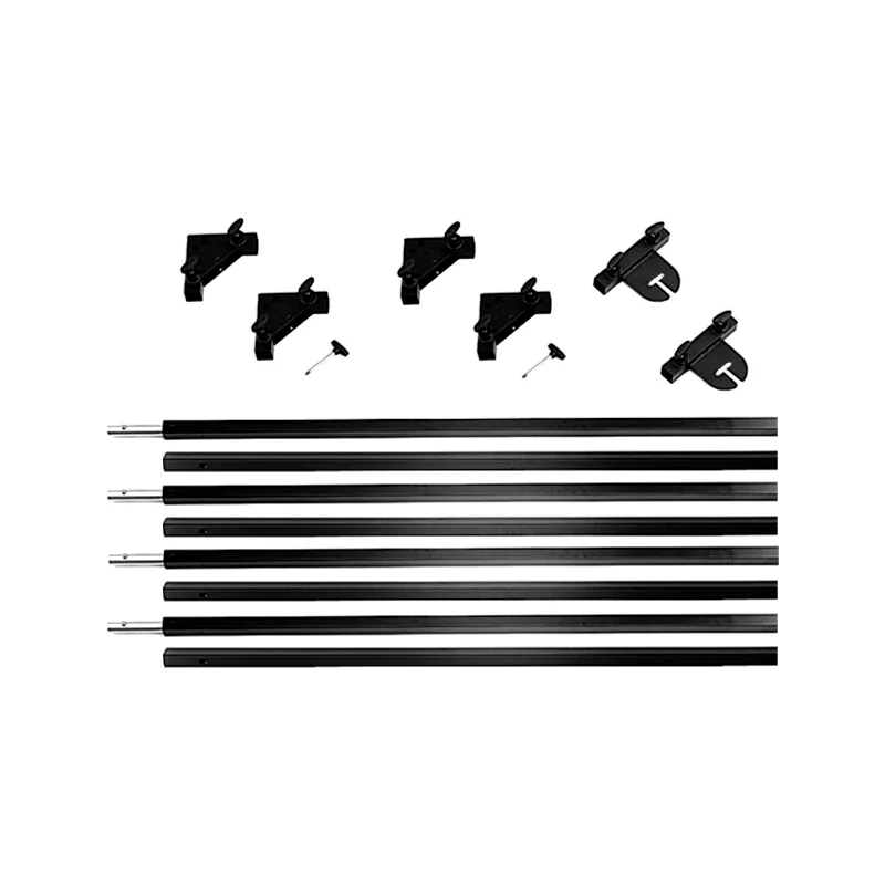 Ear type frame supporters are provided for mounting the butterfly frame on the stands, allowing for a stable frame for silks, scrims, etc. This 8 x 8 Butterfly Frame Kit can also be configured to create a 4 x 4 frame.
