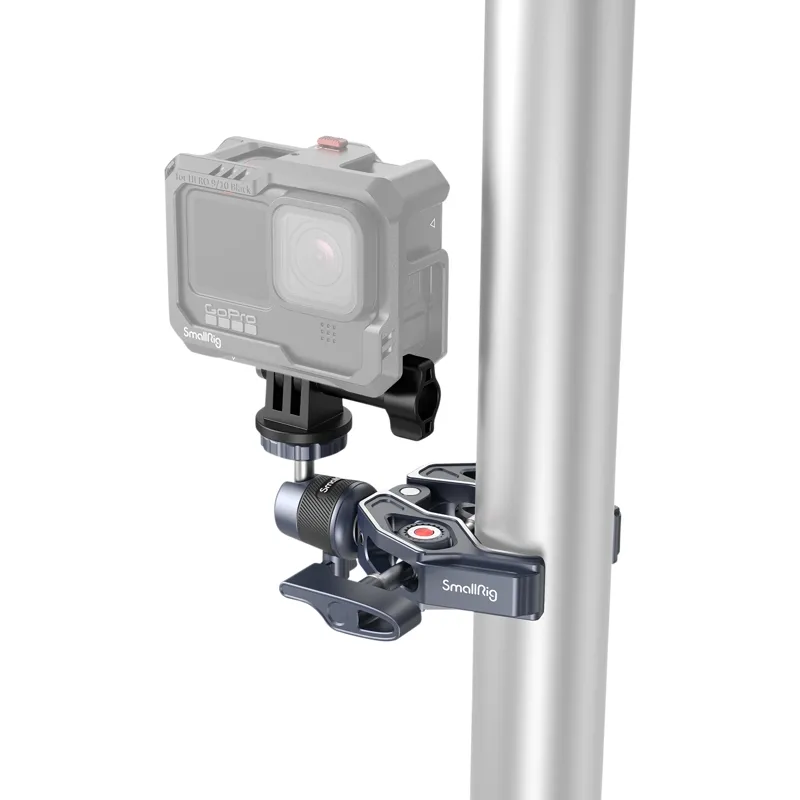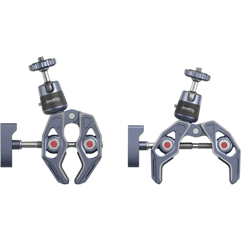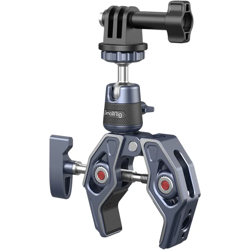 SmallRig Super Clamp with 360° Ball Head Mount for Action Cameras 4102 is made of aircraft-grade aluminum alloy and stainless steel, CNC process anodized and carved to increase sturdiness and durability. It features a skeletal design and shark clamp with stronger clamping force as well as widely compatible 1/4"-20 threaded holes, 3/8"-16 threaded holes, and ARRI 3/8"-16 locating holes. The clamp, which supports a rod of a minimum diameter of 14mm and a surface with a maximum thickness of 65mm, can quickly attach cameras, monitors, LED video lights, etc. to round pipes, tables, handlebars, tripods, and stabilizer handheld rings.