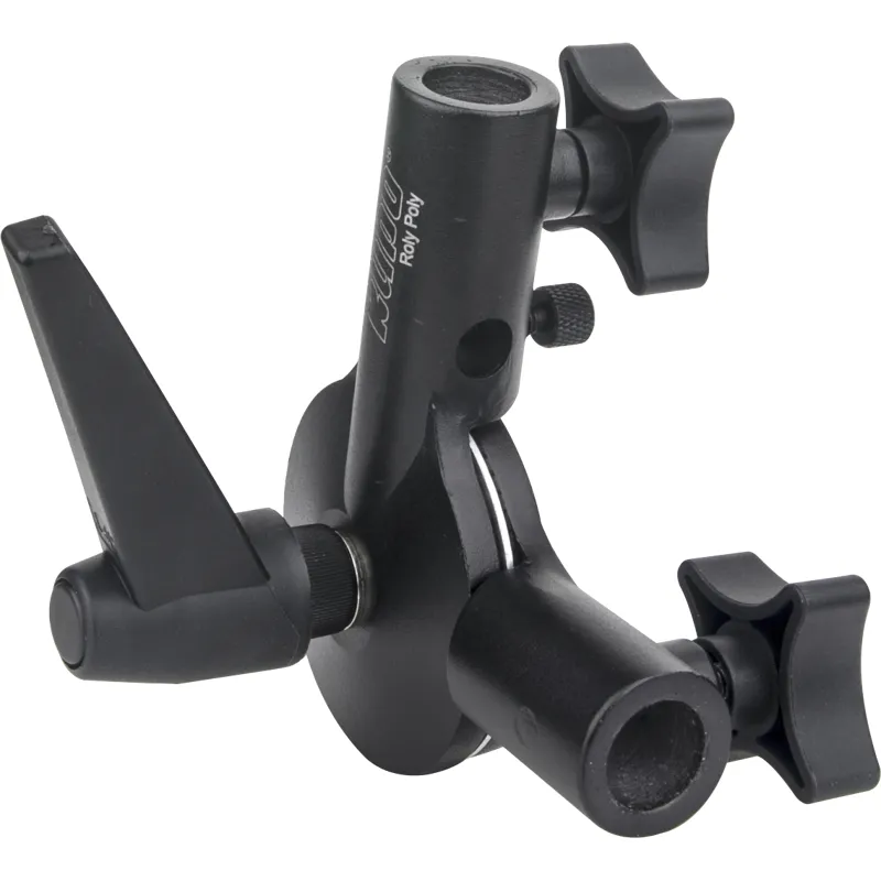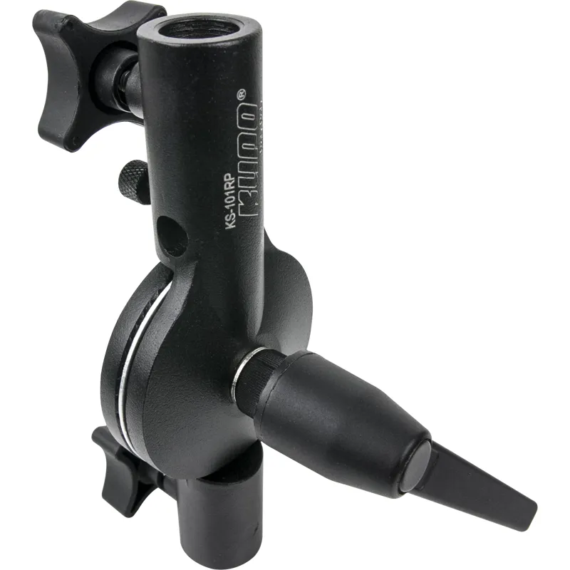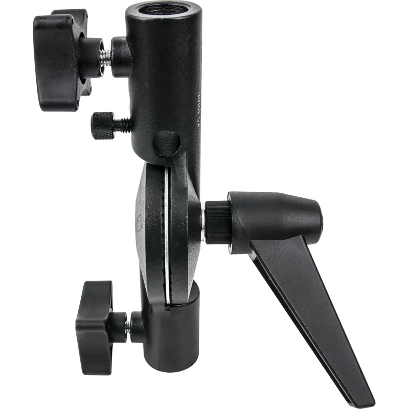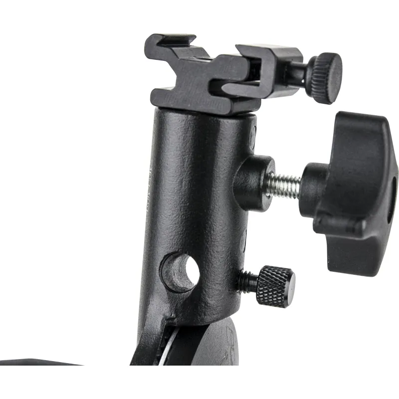 A heavy-duty cast aluminum alloy bracket which features a counterbalance mechanism designed to prevent the speedlite from flopping over when the knob is loosened. With a non-slip aluminum disk, two aluminum brackets, and a ratcheting locking handle, the speedlite or lighting fixture is able to be locked securely in place. There is also a hole with a knob-screw to lock an umbrella shaft in place.