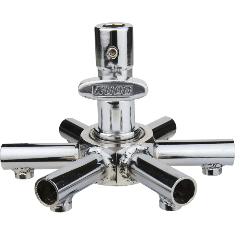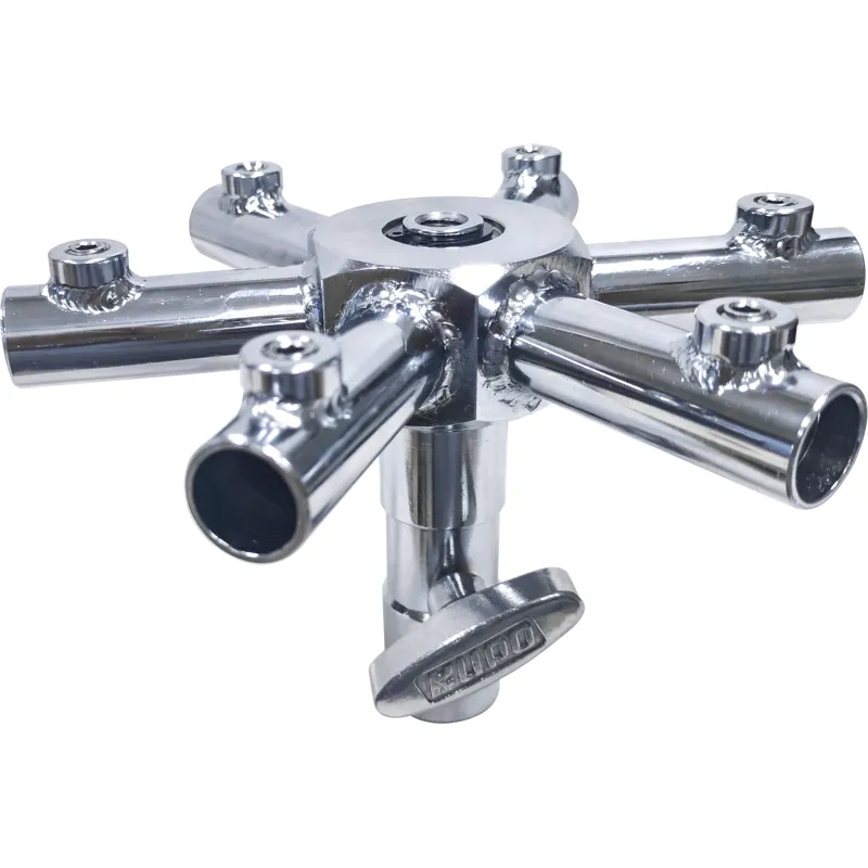 Constructed from solid steel and chrome plated, this pipe spinning gag consists of six 5/8 (16mm) baby receivers with set screws and is terminated with a TVMP adapter. This adapter allows fitting into a 1-1/8 (28mm) junior receiver or a 5/8 (16mm) baby stud. The top end features 3/8-16 threads for easy addition of a fixed plate.