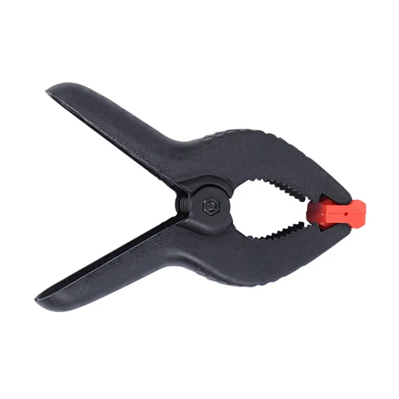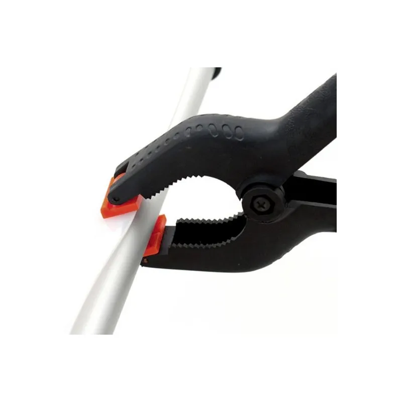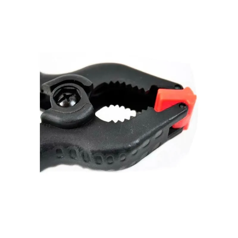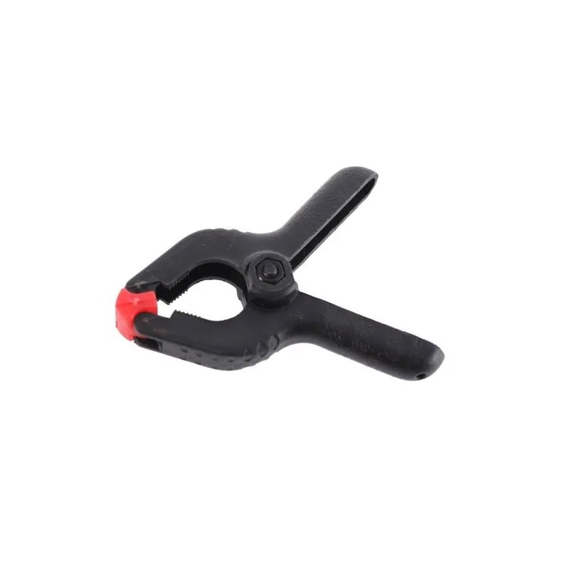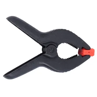 A practical, universal plastic clamp with a very strong spring to clamp background paper, background cloth or collapsible reflectors to a bar or a tube. With this clamp you can for instance prevent a background roll from unrolling. The clamps are provided with a movable top . This provides a stable fixation and uniform pressure on the object to be fastened.